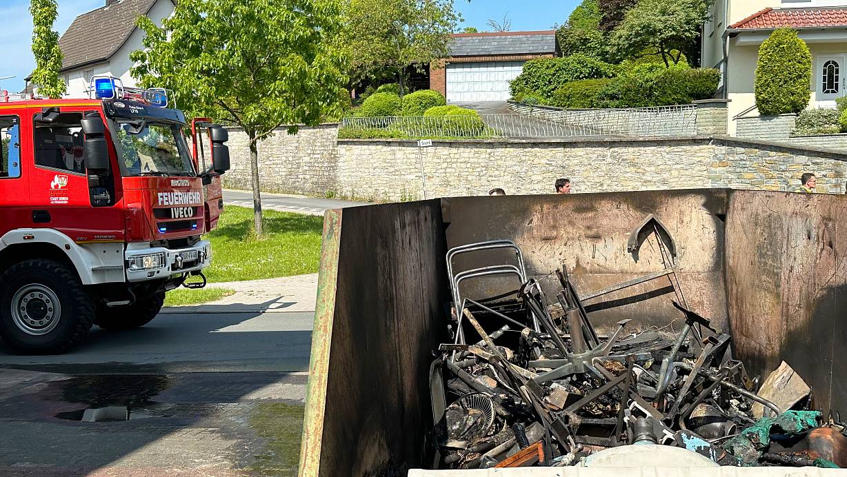 Heiß entsorgt: die Reste des ehemaligen Haarstudios Vollmer an der Bürener Straße standen am Samstagnachmittag in einem Container in Flammen. | © Ralph Meyer