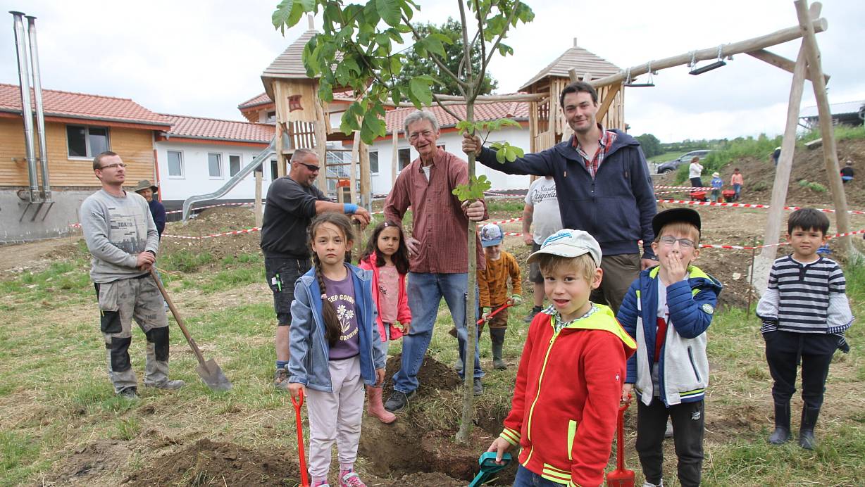 Die Kinder der Sonnengruppe pflanzten gemeinsam mit den Handwerkern und den Inhabern des Brückenhofs, Tankred und Laurenz Trautmann, vor dem neuen Kita-Gebäude einen Baum. | © Johannes Büttner