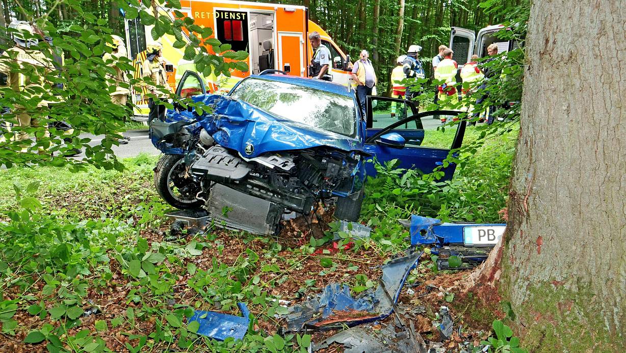 Skoda prallt an der Kreisstraße 16 bei Büren gegen einen Baum
