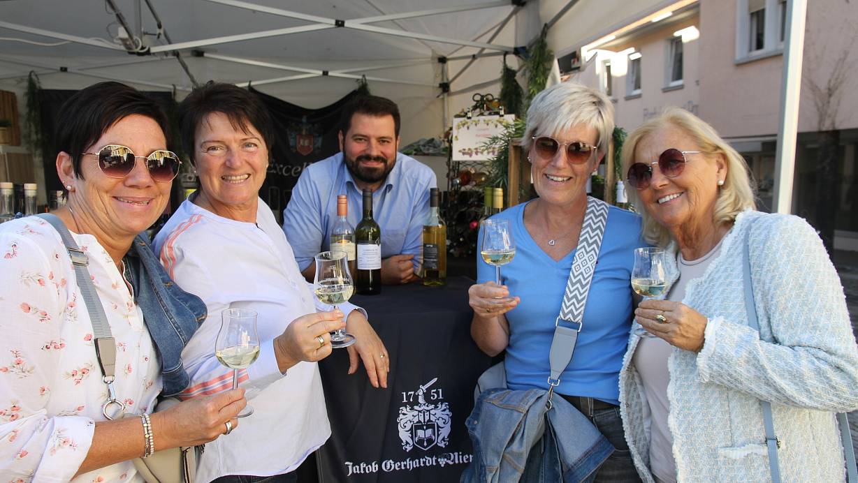 Am Weinstand der Kellerei Jakob Gerhardt Nierstein genießen den Rebensaft die Bürenerinnen (v. l.) Vera Pätzhold, Gerdi Bischof, Petra Salmen und Gerda Remm. Das Wetter sorgt zusätzlich für beste Stimmung. | © Johannes Büttner