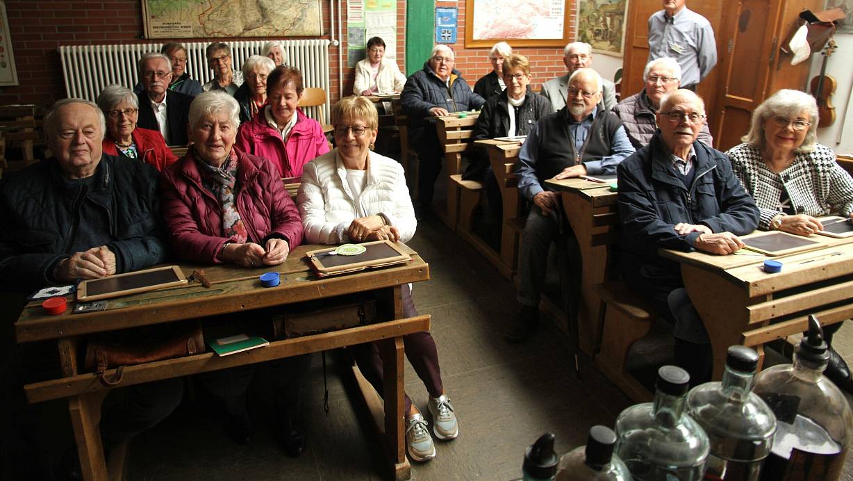 Die Gruppe der früheren Schülerinnen und Schüler nahm brav in der Klasse Platz. Anton Hillebrand (stehend) vom Bernhard-Wolff-Schulmuseum sorgte dafür, dass viele Erinnerungen aufgefrischt wurden. | © Johannes Büttner