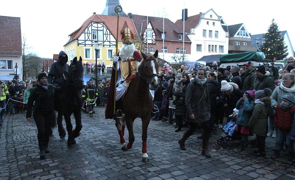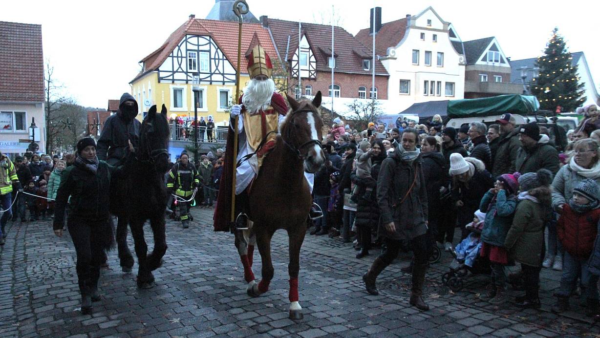 Büren. Wenn der Nikolaus die einstige Kreisstadt Büren besucht, dann sind Jung und Alt auf den Beinen. So auch Sonntagnachmittag, als der Mann mit dem weißen Bart hoch zu Ross durch die Straßen der Altstadt ritt. In seinem Gefolge rund dreihundert Kinder, Mütter, Väter und Musiker. Vom Marktplatz aus ging es über die Burgstraße, hinauf zur Seniorenresidenz, um auch deren Bewohnern eine Freude zu bereiten. Auf dem Marktplatz hatte der Nikolaus dann für jedes Kinder ein kleines Geschenk parat.