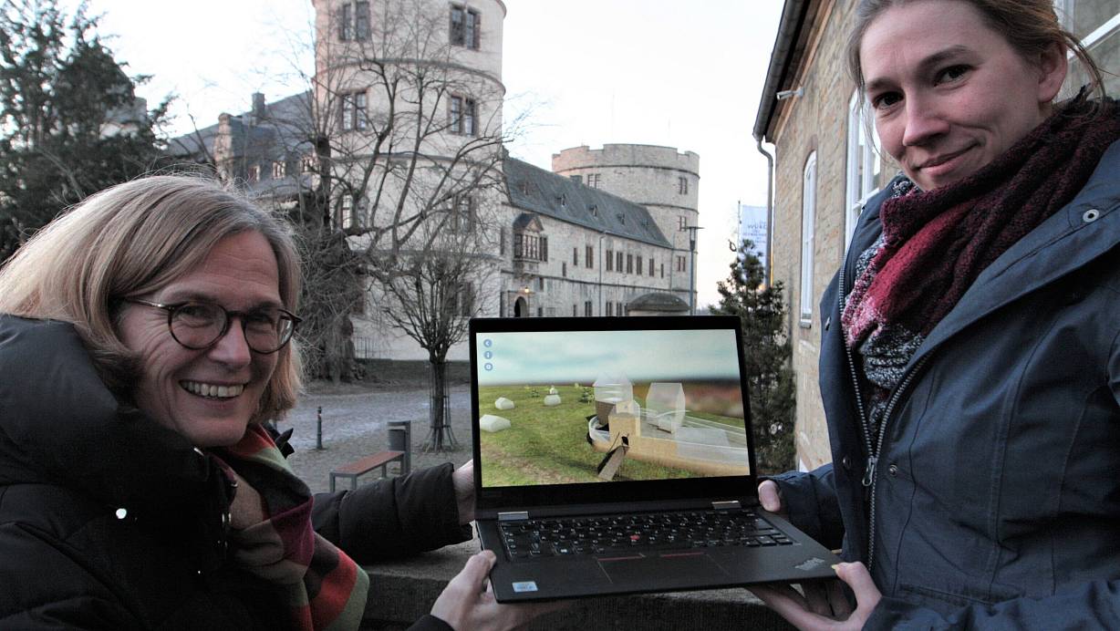 Museumsleiterin Kirsten John-Stucke (l.) und Mareike Antepoth, Projektkoordinatorin der Digitalen Wewelsburg, präsentieren anhand eines digitalen 3-D-Modells, wie Burg und die Umgebung im Mittelalter ausgesehen haben. | © Uwe Müller