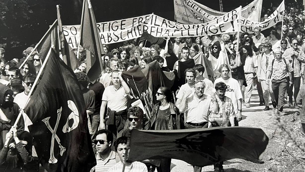 Bei der größten Demonstration gegen die Bedingungen in der Abschiebehaftanstalt zogen am Tag der Deutschen Einheit 2001 etwa 1.200 Menschen vor die JVA und durch Büren. | © Reinhard Rohlf
