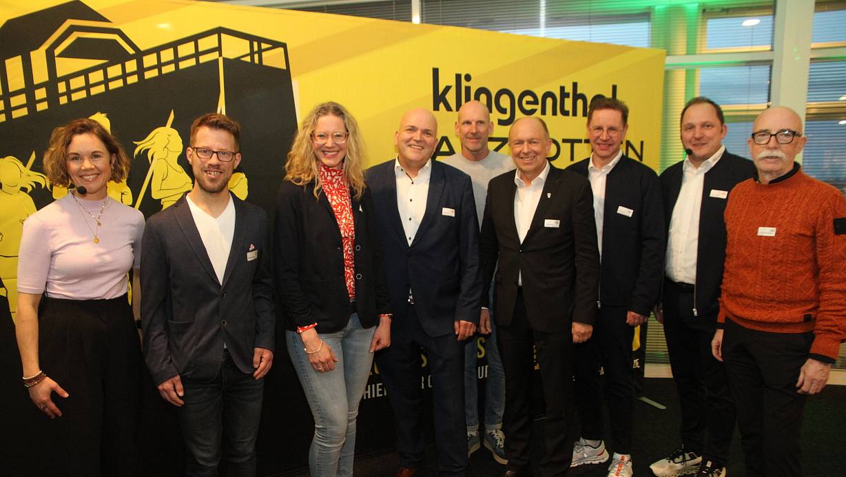 Moderatorin Julia Ures (v. l.), Steffen Rammert (Spezial Olympics), Kathrin Wibbing (Drachenpaten), Roland Hüser (Airport), Elmar Sprink (Triathlet), Landrat Christoph Rüther, Bürgermeister Ulrich Berger, Organisationsleiter Sascha Wiezynski und der Sportmediziner Klaus-Peter Hellwig diskutierten am Flughafen. | © Johannes Büttner