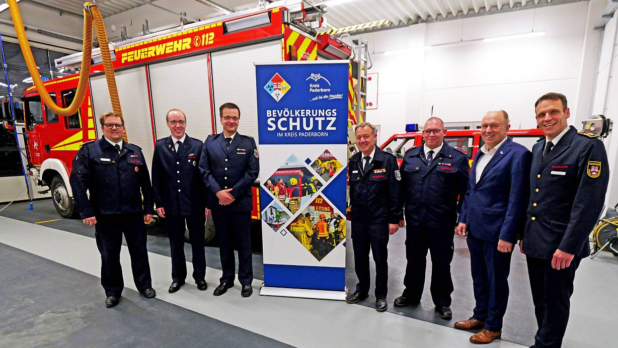 Personalwechsel bei den ABC-Einheiten: Maik Sellemerten (v. l.), Jonas Bee, Christian Hoffbauer, Matthias Strunz, Stefan Gehrke, Landrat Christoph Rüther und Kreisbrandmeister Stephan Reckhaus im Gerätehaus des Löschzuges Wewelsburg. | © Ralph Meyer