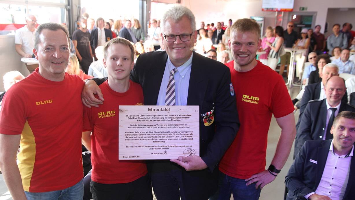 Als Auszeichnung für sein unermüdliches Engagement erhielt Dirk Kleeschulte (3. v. r.) von seinen Mitstreitern (v. l.) Andreas Schwarz, Josef Wellen und Finn Kleeschulte eine Ehrentafel, die ans Gebäude angebracht wird. | © Johannes Büttner