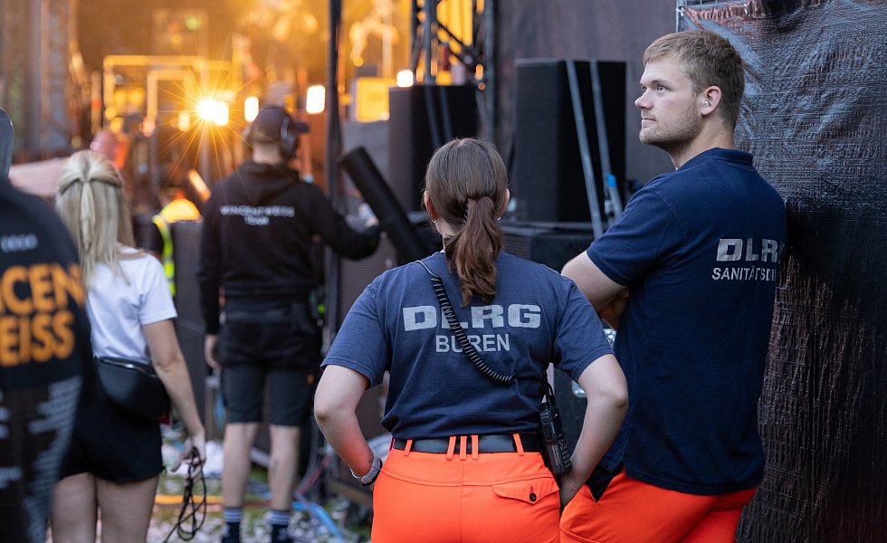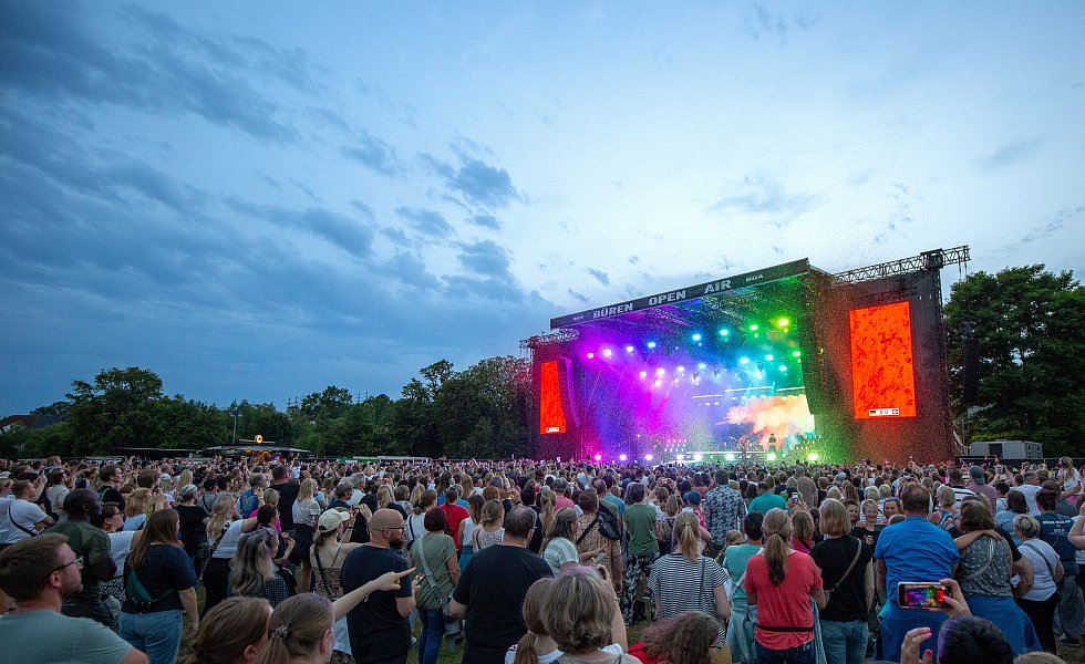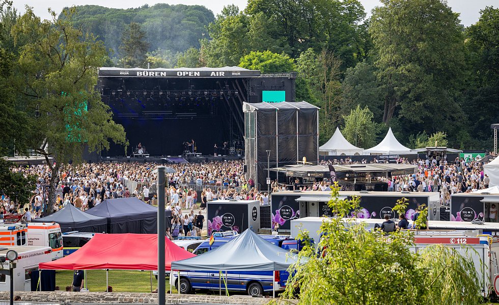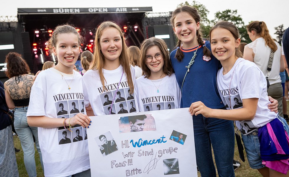 Büren. Fan-Shirts tragen an diesem Samstagabend einige Menschen in den Bürener Almeauen. Klar, auf einem Konzert gehört dies dazu. Am zweiten BOA-Rocks-Tag sind es aber nicht nur Wincent-Weiss-Shirts, die auffallen. Denn zugleich spielt die deutsche Nationalmannschaft, sodass Fußball-Trikots ebenso häufig zum Outfit gehören.