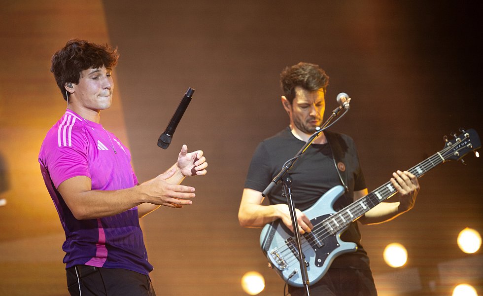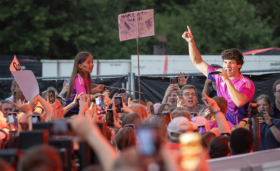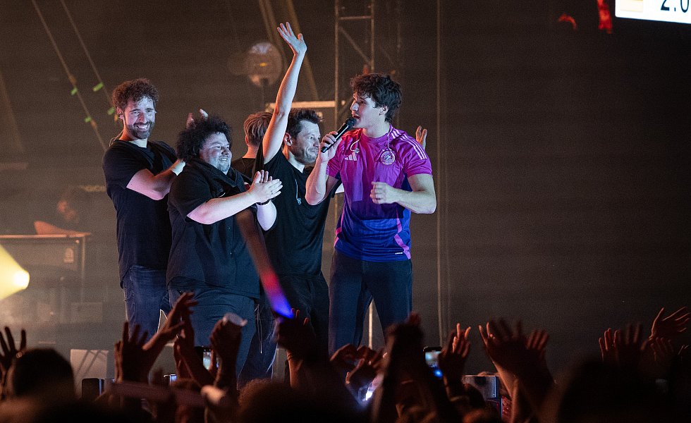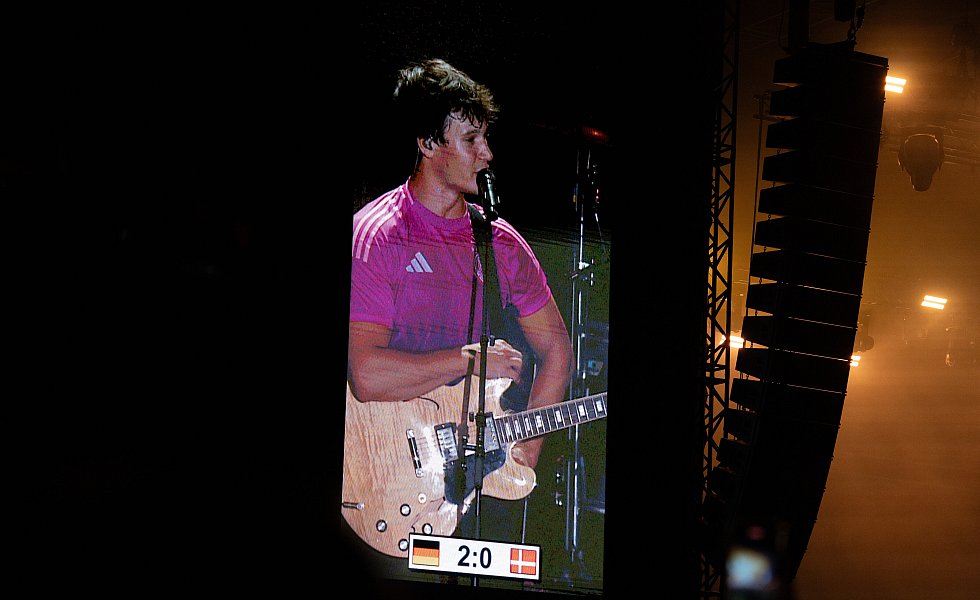 Der Spielstand wird zudem auf den zwei Leinwänden rechts und links der Bühne angezeigt: Großer Jubel, als die Tore fallen. „Ich dachte erst, es wird eine Katastrophe, während eines Spiels zu spielen, aber bei diesem Jubel...“, sagt Wincent Weiss. „Ein Tor ist schon ein Stimmungsbooster.“