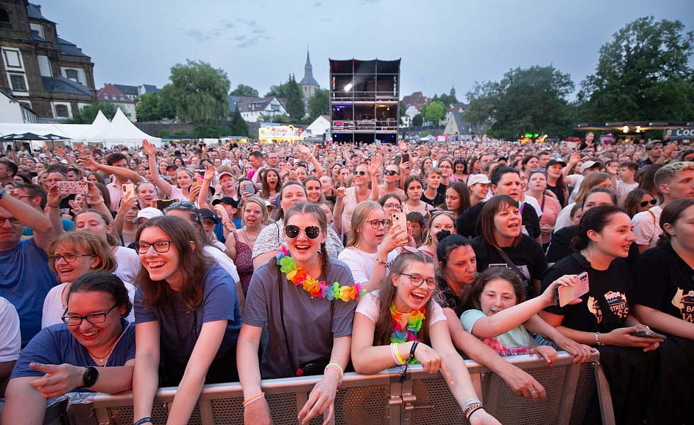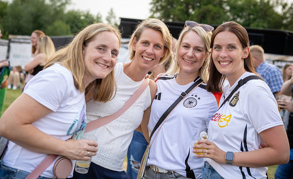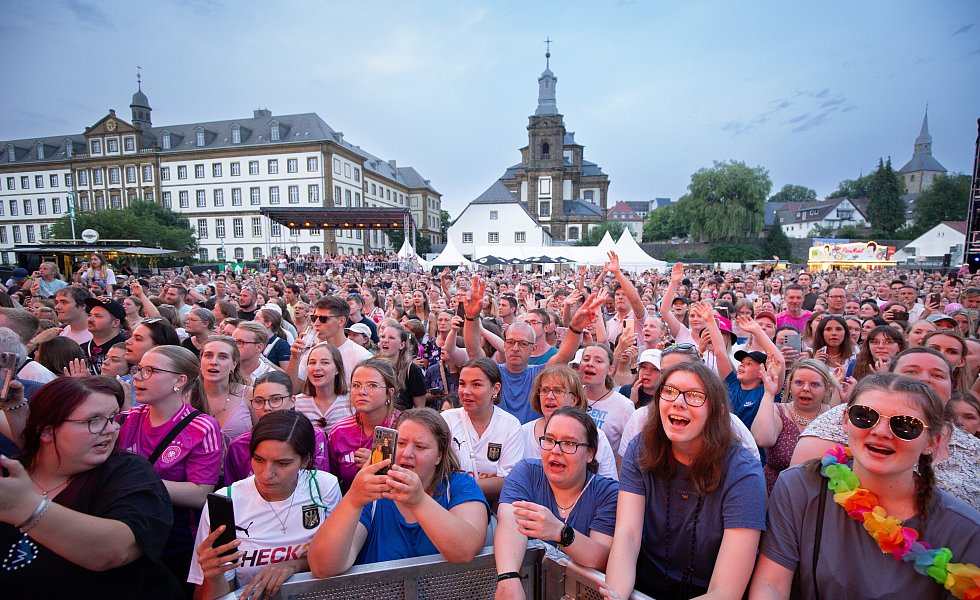 Allen voran bei Wincent Weiss, der im pinken Deutschland-Trikot die Bürener Bühne betritt. Das Publikum feiert den Popsänger zum Anfassen – ebenso wie den 2:0-Sieg.