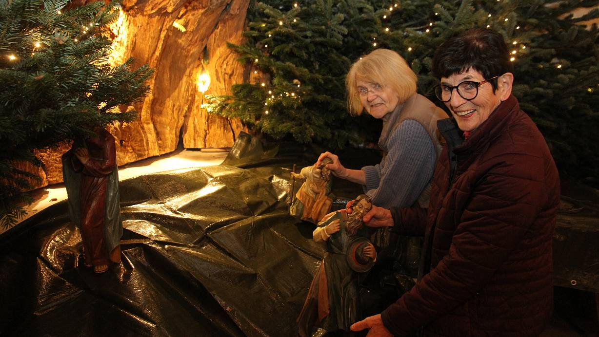 Elisabeth Knoop und Ursula Siedhoff bestücken die Krippe mit den Figuren. | © Johannes Büttner