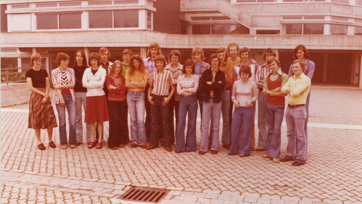Erster Bürener Realschulabschluss 1975: (v. l.) Lehrerin Marina Wagner (†) mit den Schülerinnen und Schülern, Renate Hillebrand, Rita Händel, Birgit Dittrich, Hans-Jürgen Köchling, Anneliese Füser, Fritz Müller, Marie-Theres Rüther, Hubertus Schulte (†), Rembert Moenikes, Michael Happe, Birgit Sprenger, Karl-Heinz Gottschalk, Klaus Wenke, Wolfgang Carl (†), Karl-Heinrich Werner, Johannes Hemmelgarn, Renate Albracht, Franz-Josef Böhle, Alfons Schmitte, Uli Steinmeier und Reinhard Pape. | © Archiv Hans-Jürgen Köchling