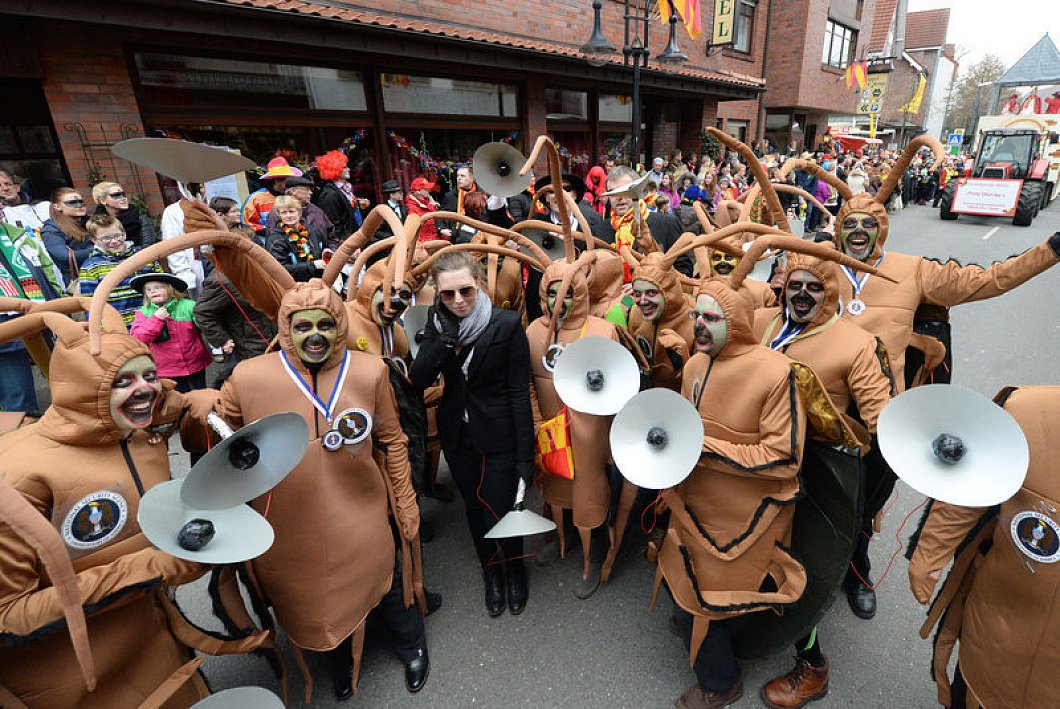 Unter dem Delbrücker Karnevalschlachtruf "He geck geck" bevölkerten Froschkönige und Sonnengötter aus Delbrück die Straßen, saßen die Narren bereits im Biergarten oder bewegten sich als Pusteblumen im Wind. Immer wieder fanden Kamelle von den Festwagen den Weg zu den Schaulustigen entlang der Strecke. So manches Bonbon landete auch in den geöffneten Fenstern. So auch bei Foto Biermann im ersten Stock. Hier feierten fröhliche Frauen als Mäuse verkleidet Delbrücker Karneval. "Wir sind Freundinnen und treffen uns jedes Jahr hier, um uns den Umzug anzuschauen", sagt Ingrid Deitmer und genießt den exklusiven Logenplatz.