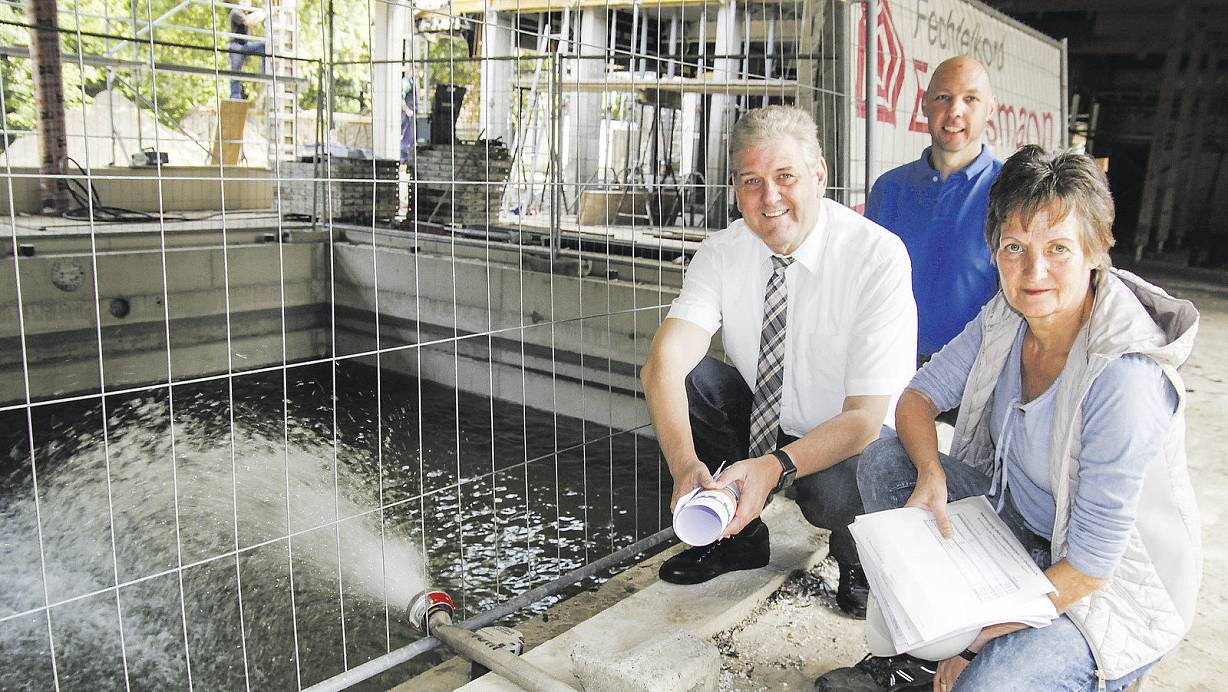 Der Wasserstrahl füllt den Rohbau: Am Rand des zukünftigen Beckens für Gesundheitskurse, bislang nur in Beton, (v. l.) Bürgermeister Werner Peitz, Schwimmmeister Ralf Osteresch und die städtische Projektleiterin Astrid Wölk. | © Karl Finke