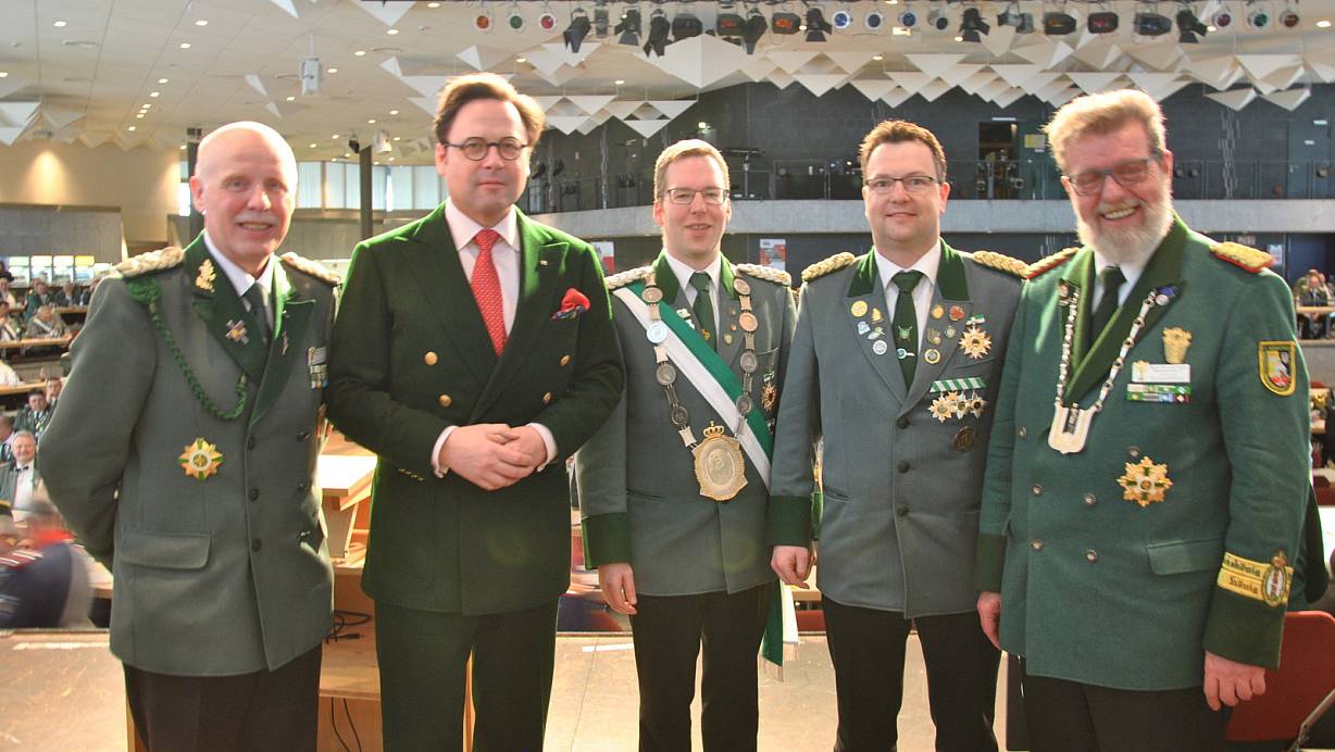 Erfolgreiche Bewerbung: Auf das Bundesfest 2022 freuen sich der stellvertretende Bundesschützenmeister Walter Finke, Hochmeister Dr. Emanuel Prinz zu Salm Salm, König Fabian Güth und Oberstleutnant Mike Witte aus Ostenland sowie Bundesschützenmeister Emil Vogt (v.l.). | © Manuel Meier-Thieschnieder