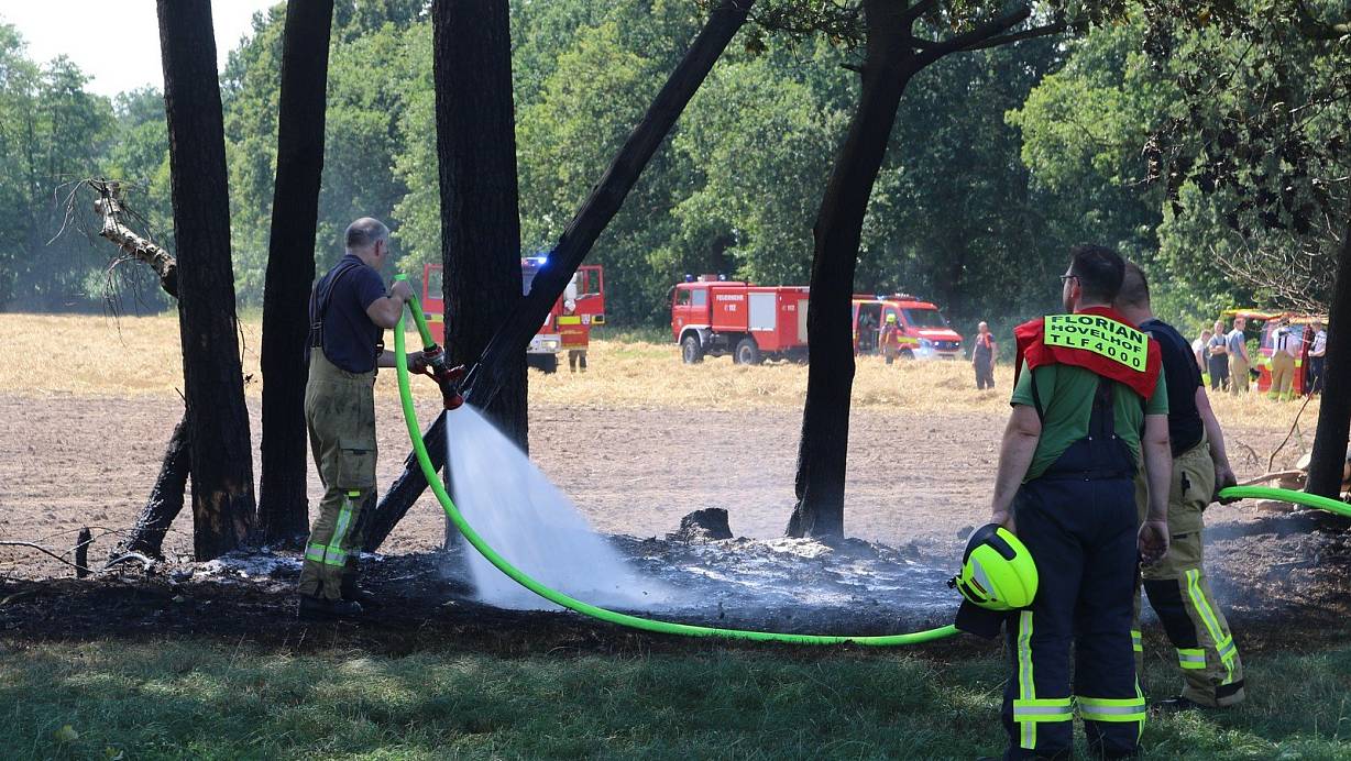 Delbrück-Ostenland. Am dritten Tag in Folge rücken Feuerwehrleute im Kreis Paderborn aus, um einen Flächenbrand zu bekämpfen. Bei Ostenland brannte ein abgeerntetes Feld, die Flammen griffen auch auf auf einen Gehölzstreifen über.