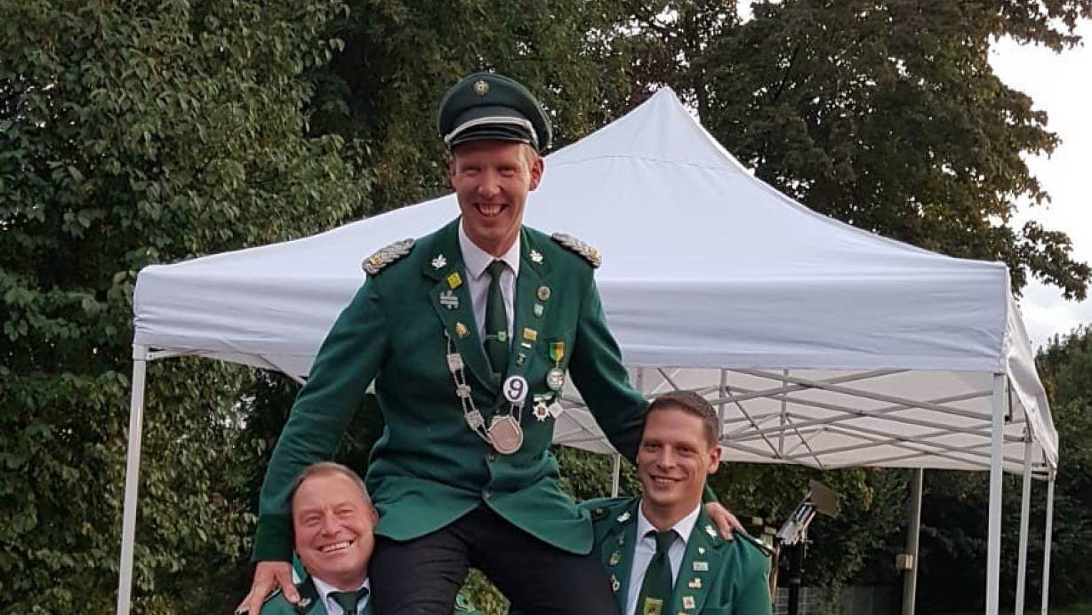Königlich: Frank Hemelingmeier jubelt auf den Schultern von (v.l.) Andreas Liedmeier und Michael Schulte. | © Bürgerschützen