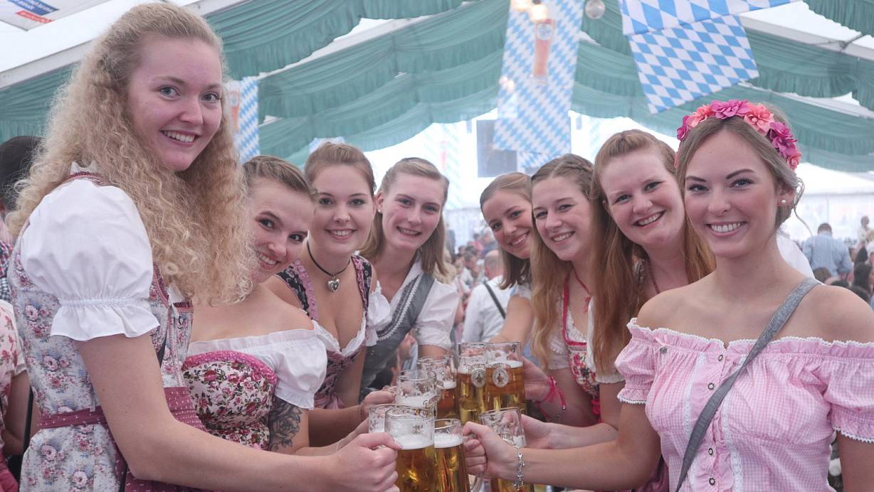 Dirndl und Lederhosen sind am Montagvormittag schon fast Pflicht im Katharinenmarkt-Festzelt. Angestoßen wird nicht zwangsläufig mit Maßkrügen. Auch halbe Liter Bier sind erlaubt. | © Jens Reddeker