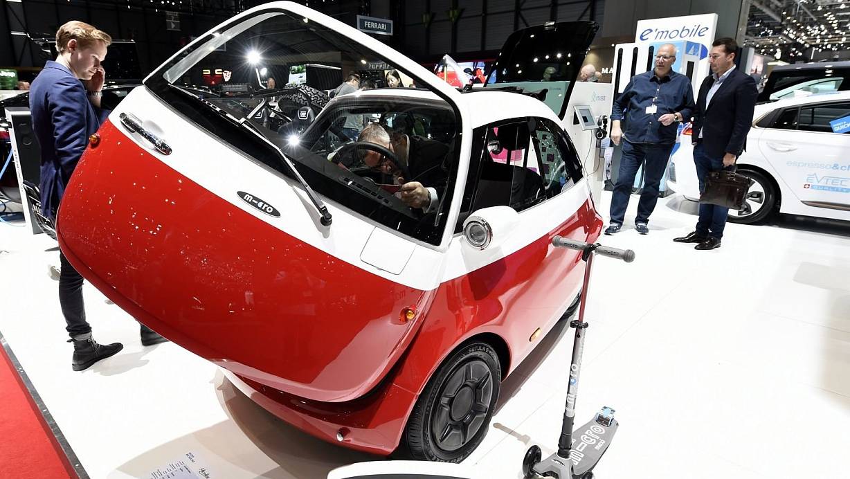 Der Microlino im Januar 2018 bei einer Präsentation in Zürich. Rechts daneben ein Elektroscooter, wie er ebenfalls von der Micro-Gruppe produziert wird. | © picture alliance / Alexandre Marchi/MAXPPP/dpa