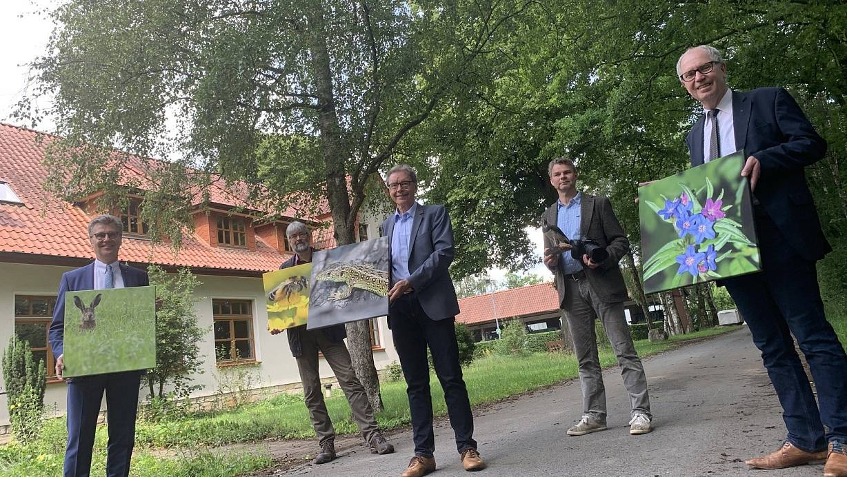 Die Farben der Natur zeigen (v. l.) Hubert Böddeker (Sparkassen-Stiftung), Peter Rüther (Leiter der Biostation), Christoph Schön (Zweckverband Naturpark Teutoburger Wald/Eggegebirge), Heiko Arjes (Arbeitsgruppe Naturfotografie) und Landrat Manfred Müller. | © Jens Reddeker