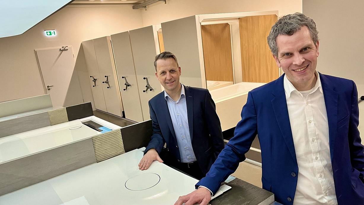 Andernorts lagern in Magazin-Regalen die Aktenberge der Vergangenheit, bei Bette haben die Showroom-Designer diverse Wannenmodelle in die Rollschränke eingebaut. Im Vordergrund zeigen der geschäftsführender Gesellschafter Thilo Pahl (r.) und sein Kollege Sven Rensinghoff die neueste Duschwanne mit ebenerdigem Ablauf. | © Jens Reddeker