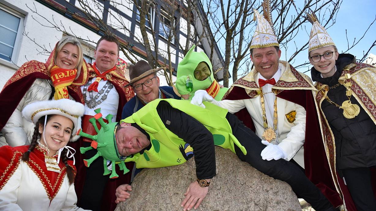 Gardetänzerin Kathi Wook, das Kranzkönigspaar Carsten und Mareike Strunz, der Vorsitzende Peter Josephs, Vize-Präsident Ralf Brüggenthies, Prinz Christian I. Hartmann und Jugendprinz Mats Carl I. Wulf (v. l.) bringen das Omikron-Virus, im Film gespielt vom zweiten Vorsitzenden Lars Rodewald, mit guter Laune zur Strecke. | © Karnevalsverein Eintracht Delbrück