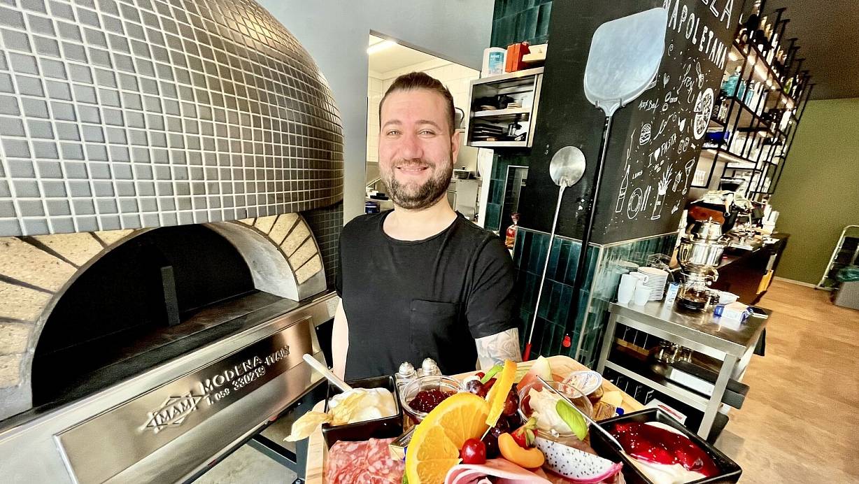Benjamin „Benni“ Demir präsentiert eine Frühstücksplatte. Neben ihm ist der italienische Pizzaofen zu sehen. | © Jens Reddeker
