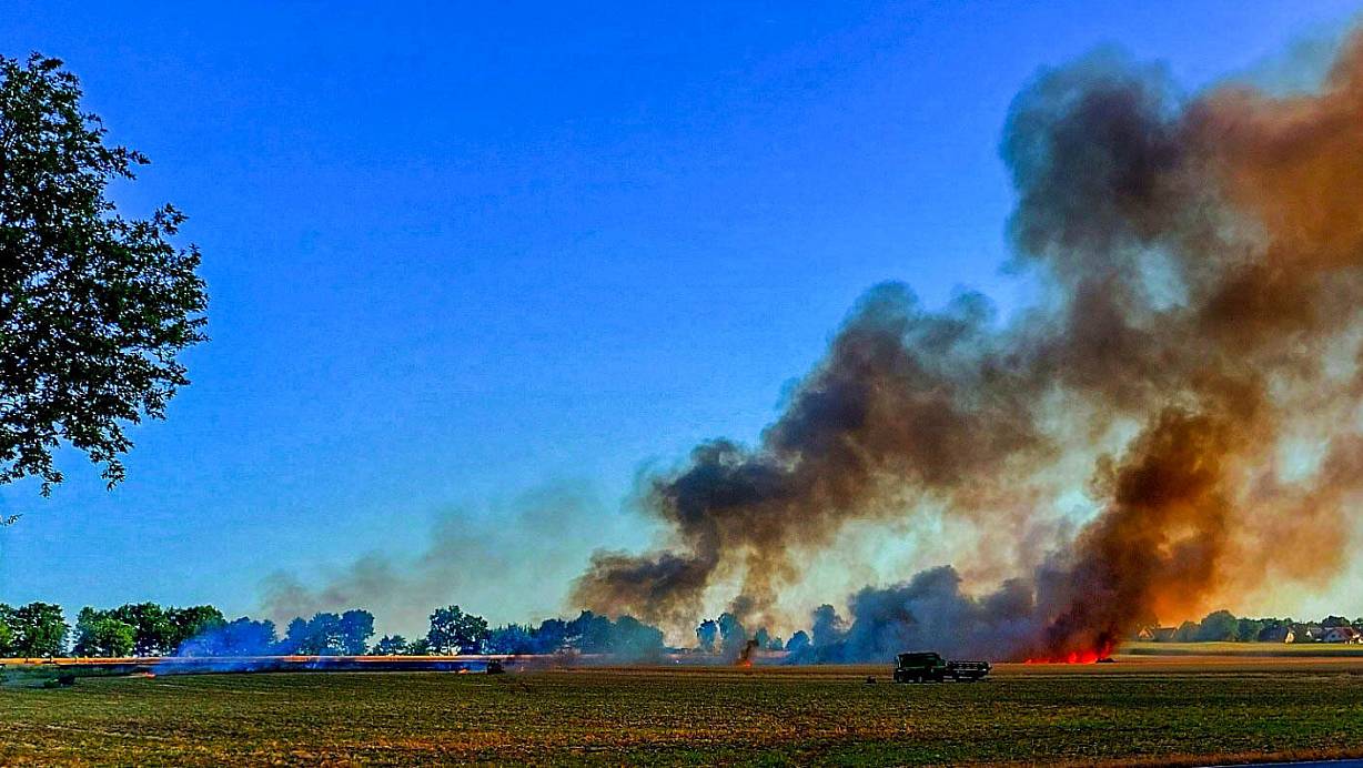 Dichte Rauchwolken stehen über der Feldflur im Osten des Delbrücker Stadtteils Westenholz. | © Feuerwehr Delbrück/Meinolf Brökelmann