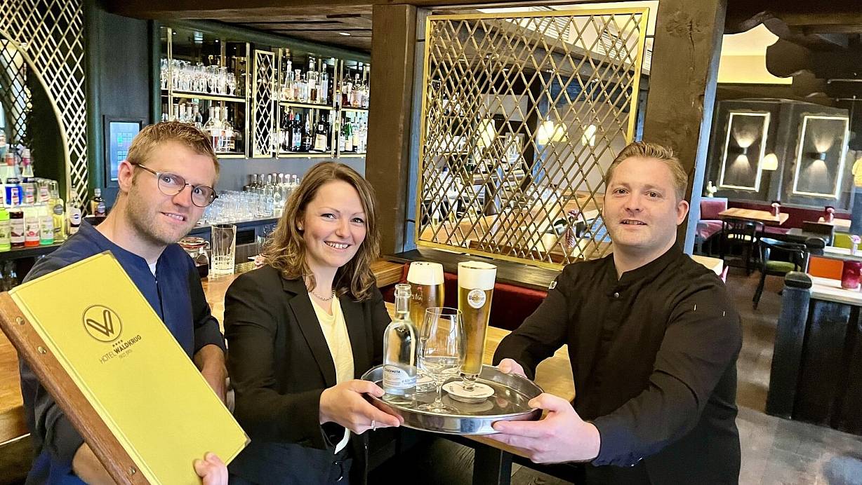 Martin, Victoria und Raphael Strunz (v. l.) übernahmen 2016 die Geschäfte im Waldkrug von ihren Eltern Veronika und Klaus. Sie begrüßen die Gäste im frisch renovierten Restaurant. | © Jens Reddeker