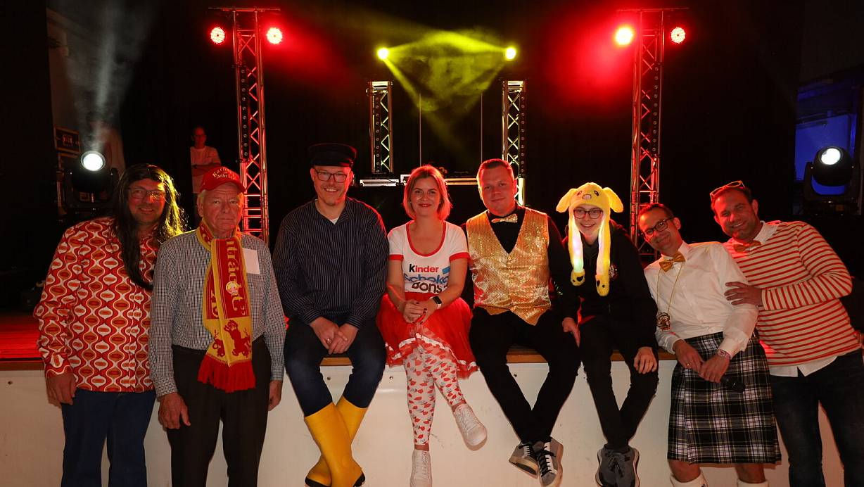 Auf die Party mit Top-Acts freuen sich (v. l.) der Vize-Vorsitzende Lars Rodewald, Mottogeber Klaus Kramer, Prinz Christian I. Hartmann, das Kranzkönigspaar Mareike und Carsten Strunz, Jugendprinz Mats Carl I. Wulf, der Vize-Präsident Ralf „Nippel“ Brüggenthies und Präsident Peter Hartmann. | © Regina Brucksch