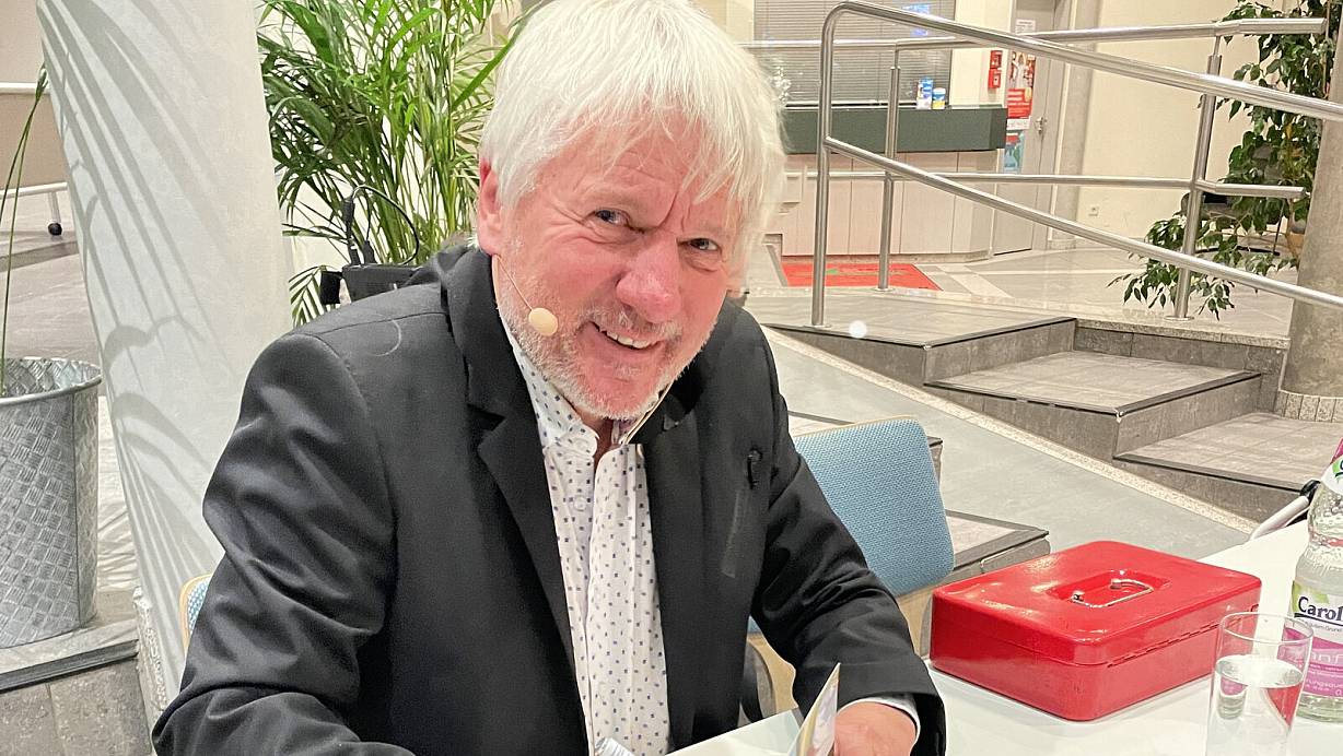 Jürgen Becker signiert in der Pause seine Bücher in der Delbrücker Stadthalle. | © Carola Drabon