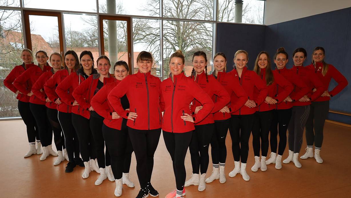 Die Delbrücker Prinzengarde mit (v. l.) Laura Sieweke, Raphaela Heimann, Christina Driller, Miriam Rexhepi, Svenja Busen, Victoria Reiher, Laura-Lee Lohmann, den Trainerinnen Verena Biermeyer und Christina Eikel, Mirjam Koch, Elisa Lindemann, Jenny Mersch, Antonia Steffen, Lea Kleine, Luisa Hagenhoff und Judith Rath probt für ihre Abschiedssession. | © Regina Brucksch