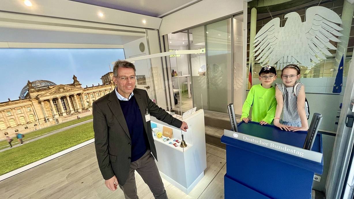 Am nachempfundenen Rednerpult des Deutschen Bundestags verschaffen sich die Geschwister Pauline und Lauritz Gehör. Die Angebote im Inneren des Lastwagens werden auch von Michael Hesse betreut. | © Jens Reddeker