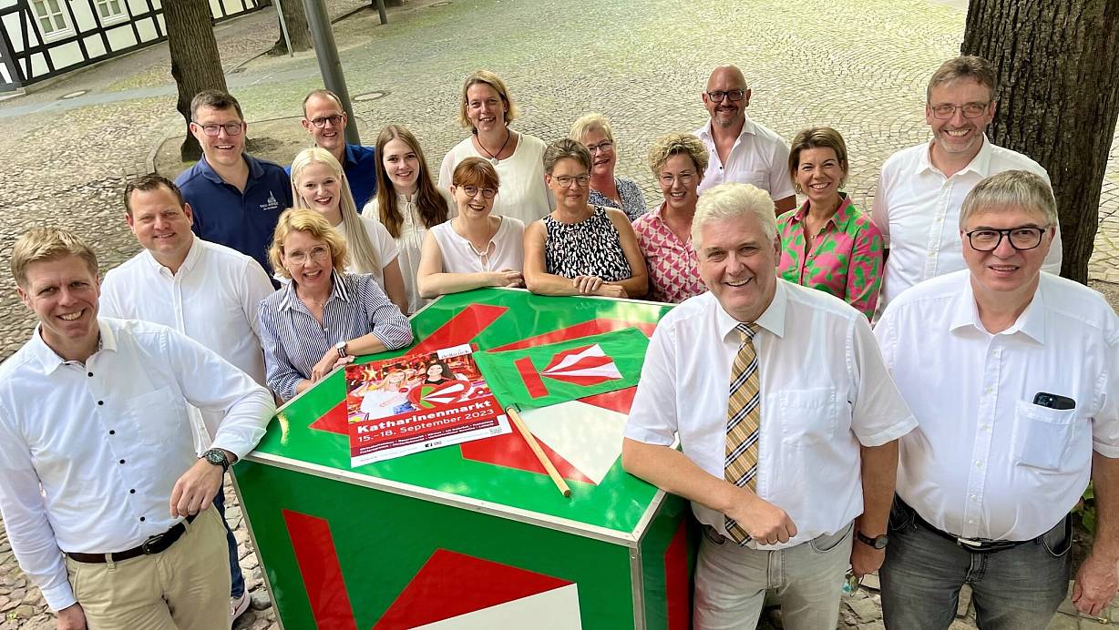 Der Sprecher des Katharinenmarkt-Ausschusses, Peter Lücke (l.), und Bürgermeister Werner Peitz (vorne, 2. v.r.) blicken mit den Ausschussmitgliedern voller Vorfreude auf den Start der Feier-Tage Mitte September. | © Jens Reddeker