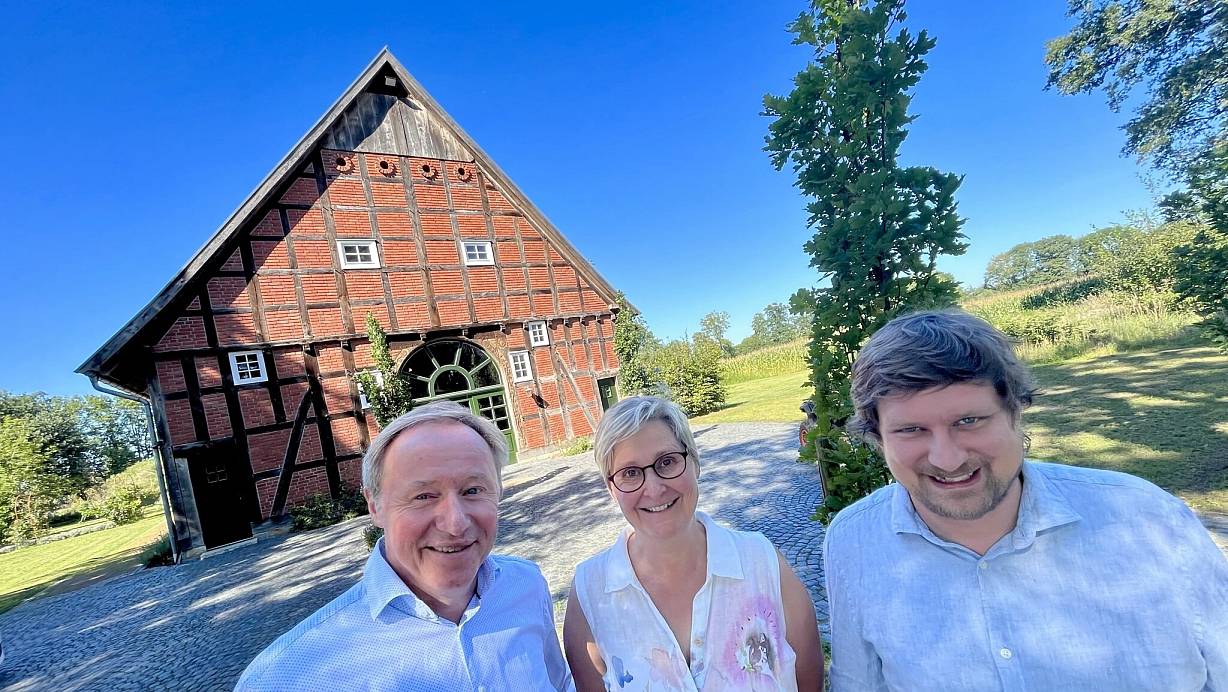 Hubertus und Margret Rolf (v. l.) präsentieren am Sonntag beim Tag des offenen Denkmals gemeinsam mit Architekt Jonathan Gröne den fast fertigen Hof Lakmann nach der rund zehnjährigen Sanierung. Im Oktober will das Paar dort einziehen. | © Jens Reddeker