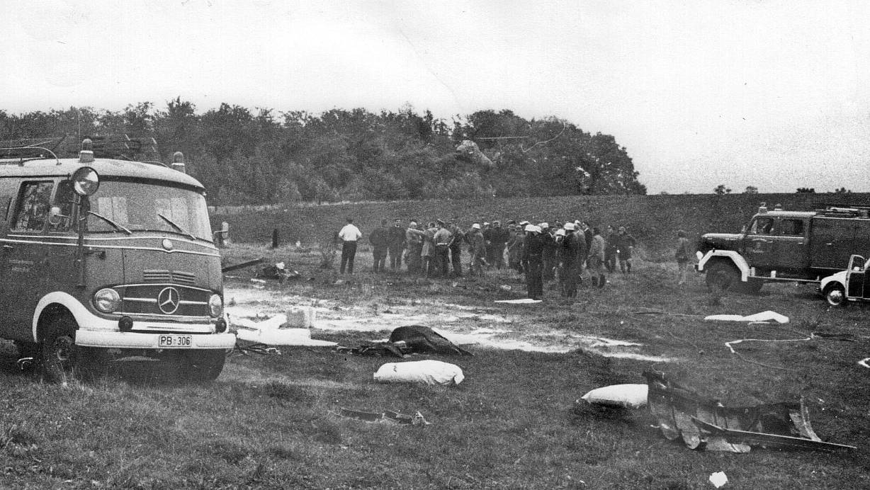 Die Absturzstelle in Sudhagen in den Mittagsstunden des 26. September 1975. Das Helikopterwrack ist von einem Löschschaum-Teppich bedeckt. | © Dieter Butkus