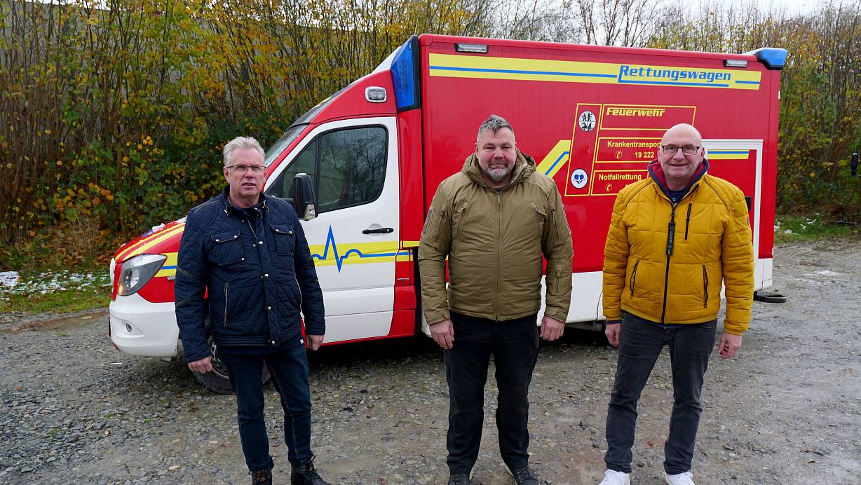 Auch dieser Rettungswagen aus dem Kreis Herford geht auf die Reise Richtung Ukraine. Darüber freuen sich (v. l.) Heinrich Heinrichs, Martin Steffens und Johannes Grothoff. Der Wagen ist inzwischen volkgepackt mit Hilfsgüterm aller Art. | © Ralph Meyer