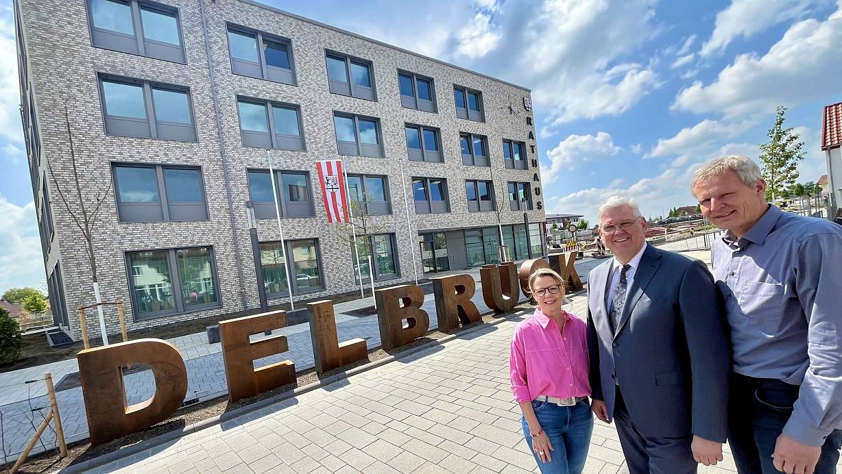 Projektleiterin Stefanie Volkmer, Bürgermeister Werner Peitz und Bauamtsleiter Markus Hückelheim sind stolz auf das neue Delbrücker Rathaus. Die Stadtverwaltung arbeitet damit wieder gemeinsam unter einem Dach. | © Jens Reddeker
