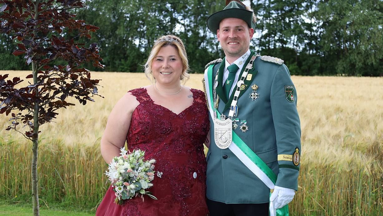 Marcel und Maren Schwabe feiern das Finale ihrer Amtszeit. Die Königin des Delbrücker Ortsteils bekommt beim Schützenfest für ihr weinrotes Kleid viel Applaus.