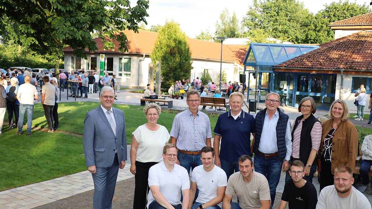 Die Eröffnung des Schöninger Dorfplatzes feiern (hinten v.l.) Bürgermeister Werner Peitz, Christiane Rolf, Friedhelm Börger, Franz-Josef Ramsel und Leo Brink vom Arbeitskreis, die Landschaftsarchitektinnen Andrea Kulik und Doris Fecke, (vorne v.l.) Julian Schulte und Marcus Horenkamp vom Arbeitskreis sowie die Garten- und Landschaftsbauer Alexander Schulze-Dasbeck, Gino Osmers und Martin Keller. | © Regina Brucksch
