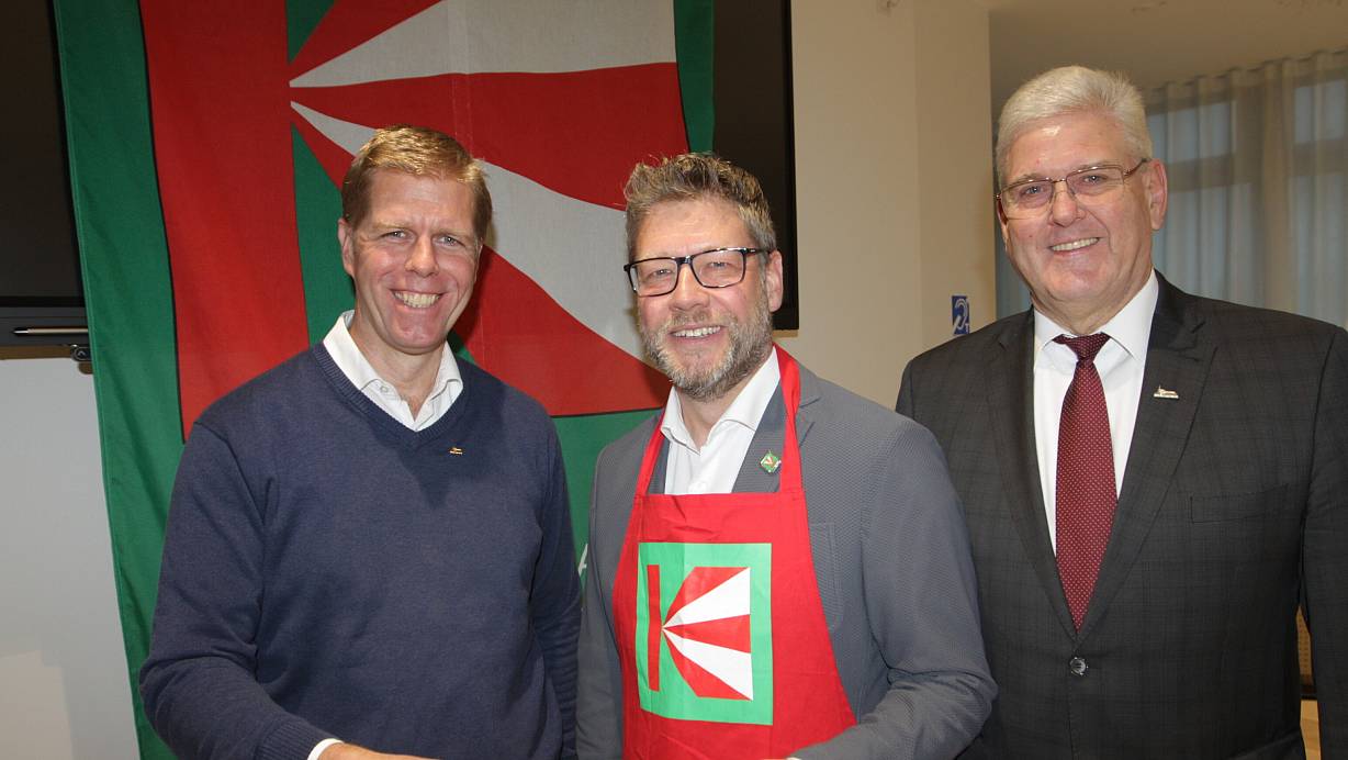 Peter Lücke (l.) war 18 Jahre lang Sprecher des Festausschusses für den Katharinenmarkt. Er gibt den Staffelstab nun an Ralf Engelmeier weiter. Bürgermeister Werner Peitz gratulierte. | © Uwe Müller