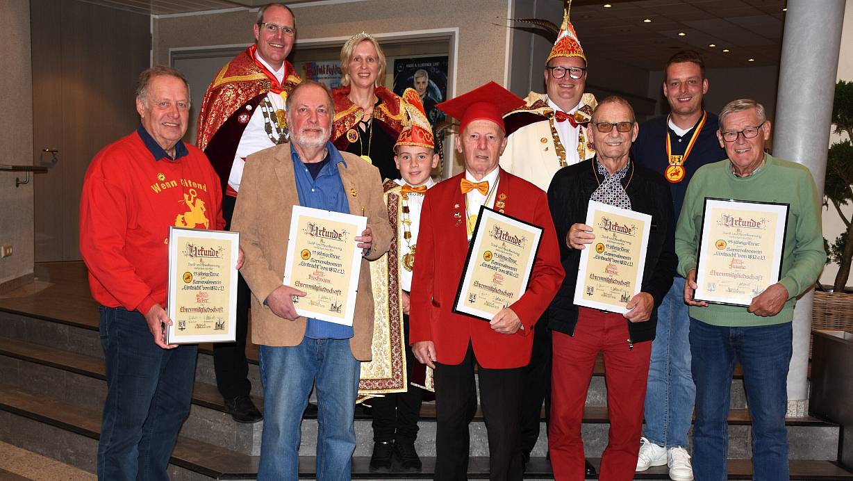 Wilfried Reker (vorne v.l.), Herbert Brockmann, Norbert Goer, Gerhard Kessler und Rudolf Fraune erhalten 55 Jahre nach ihrem Vereinseintritt die Ernennung zu Ehrenmitgliedern. Es gratulieren (hinten v.l.) das Kranzkönigspaar Manfred und Sandra Kampmeier, Kinderprinz Bastian Fortmeier, Prinz Gregor Hüllmann und das neugewählte Elferratsmitglied Steffen Kückmann. | © Eintracht/Klaus Gosny