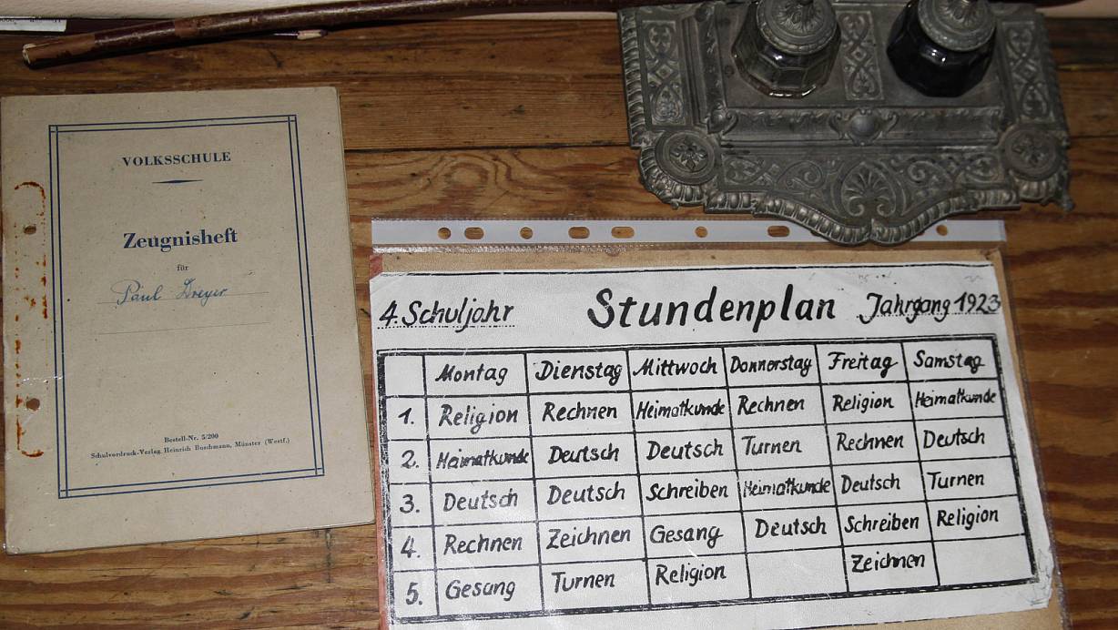 Auf dem Lehrerpult Stundenplan, Zeugnis und Tintenfässer: Manche Fächer sind längst verschwunden oder Inhalte mit neuen Namen versehen. | © Foto: Maurice Fröhleke