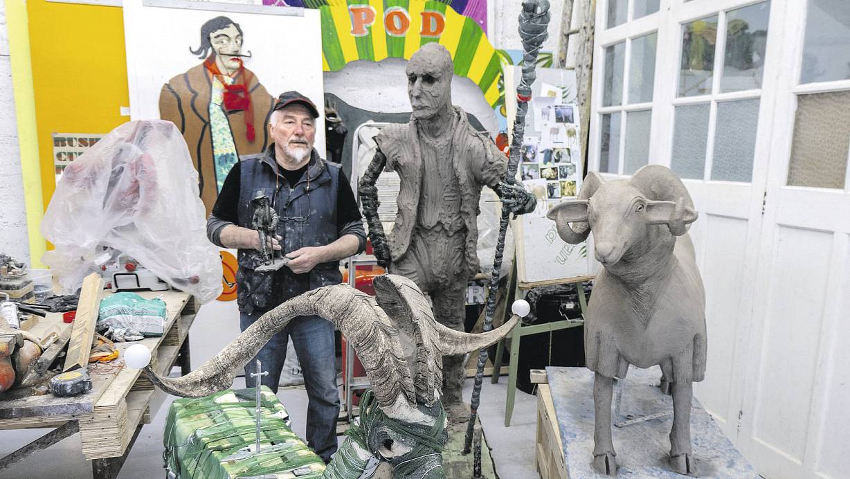 Blick in die Werkstatt: Während Bildhauer Alan Ryan Hall das Modell des Schäfers in der Hand hält, ist ein Schaf bereits vollendet. Dem Schäfer fehlen noch ein Arm, Hut und der Hirtenstab. Beim Ziegenbock, dessen Unterkonstruktion bereits im Rohbau fertig gestellt ist, lässt sich der Künstler beim Kopf durch die Natur inspirieren. Fotos: Ralph Meyer|| | © Ralph Meyer
