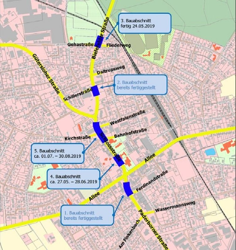 Im Anschluss steht der vierte Bauabschnitt in der Schloßstraße auf der Höhe des Schlossgartens und des Katholischen Pfarrheims an. Laut Plan geht es am Montag, 27. Mai, los. Die bestehende Mittelinsel bei der Kirche wird abgebaut und eine neue Querungshilfe für Fußgänger zwischen Hövelmarkt/Kirchhof und Schlossgarten/Senne-Bücherei errichtet.