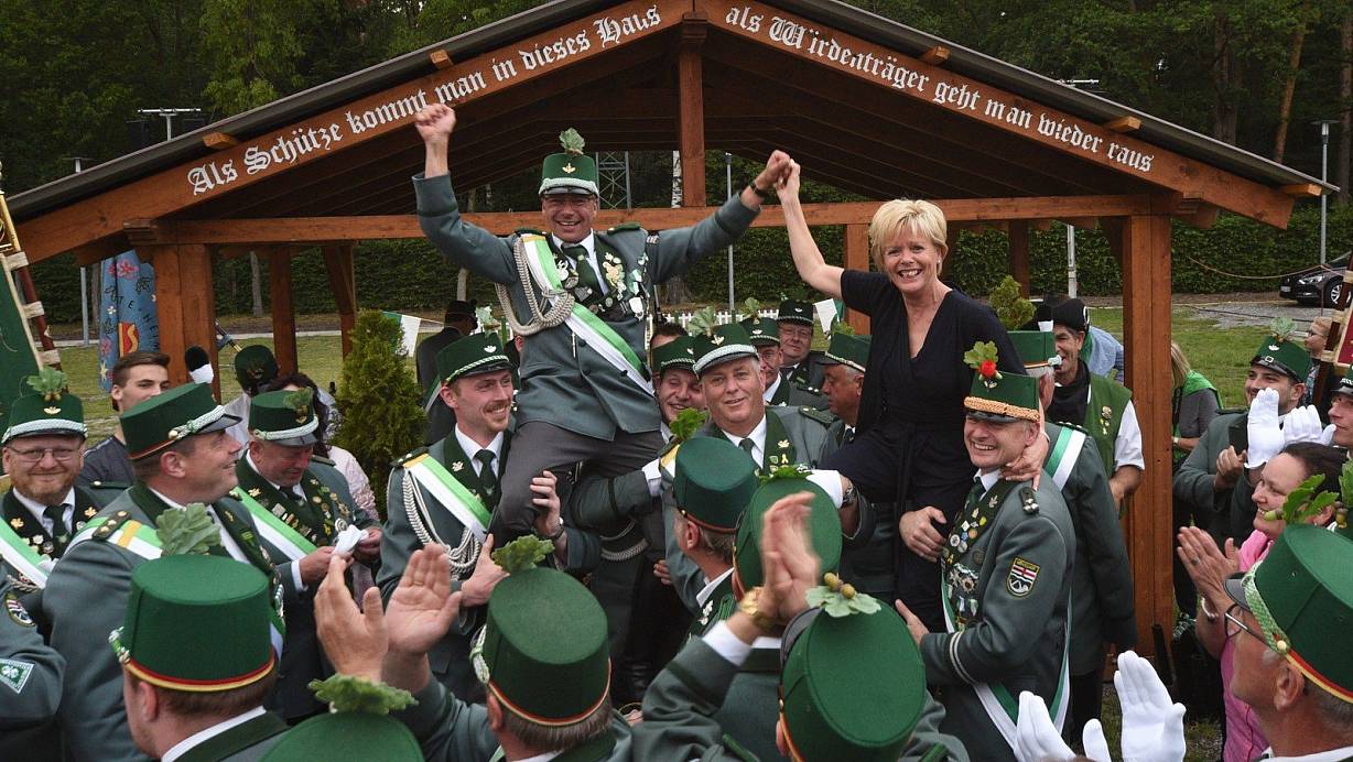 Umjubelt: Frank Bröckling und Heidi Auster werden nach dem Vogelschießen als neues Königspaar freudig begrüßt. Sie stehen am Wochenende in der Sennegemeinde im Mittelpunkt. | © privat