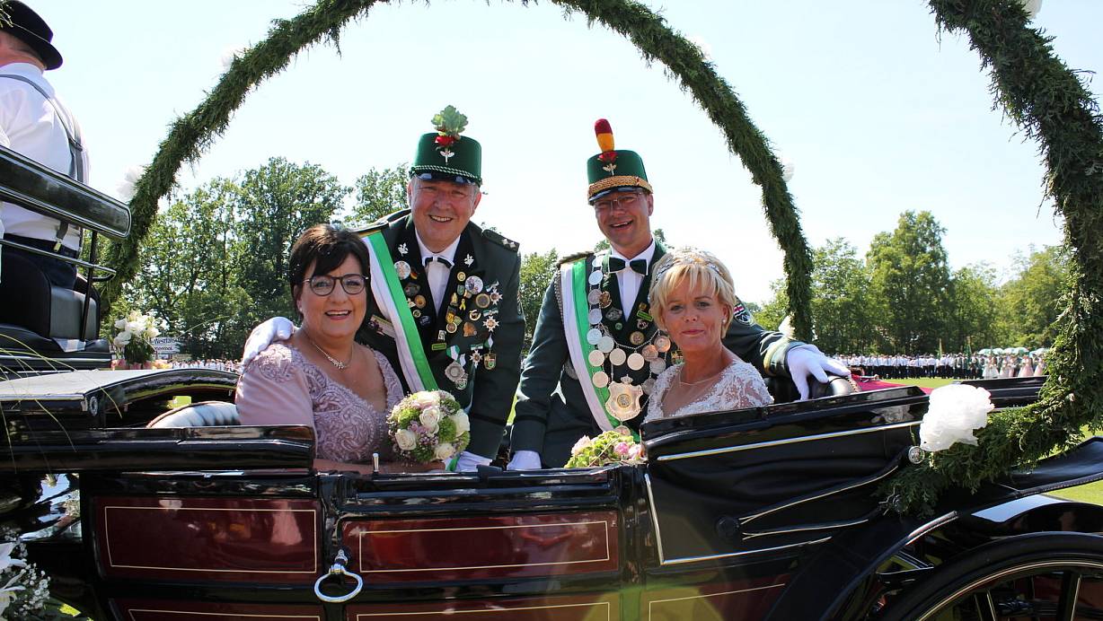 Beste Schützenfestlaune: Das Zeremonienmeisterpaar (v.l.) Rita Fockel und Jochen Franke-Bröckling sowie das Königspaar Frank Bröckling und Heidi Auster grüßen aus der Kutsche. | © Julia Stratmann