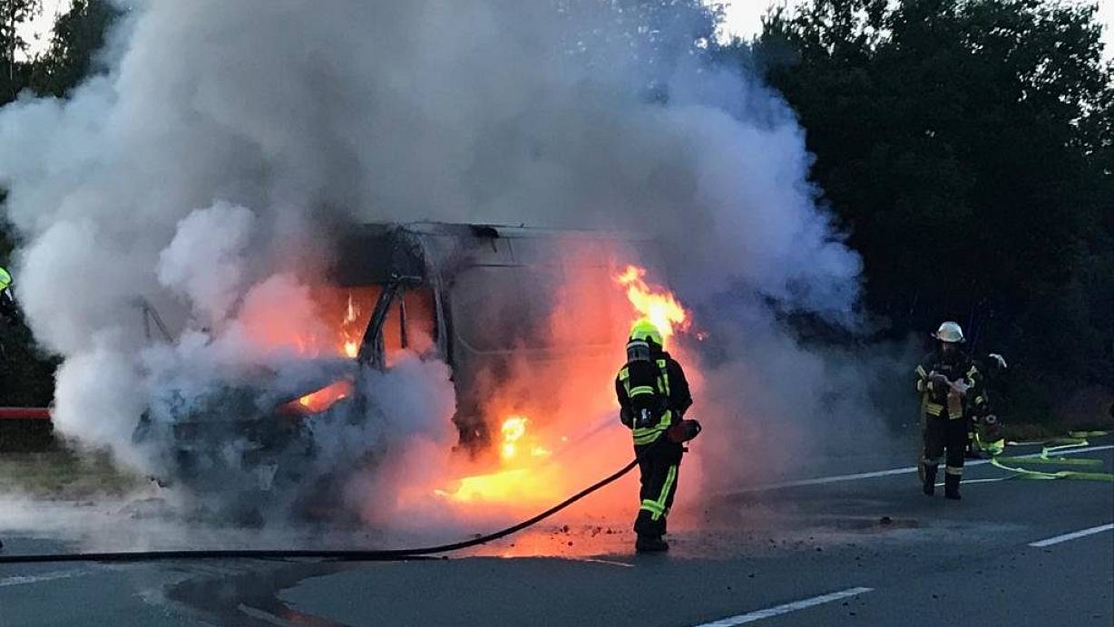 Als die Feuerwehr am Einsatzort eintraf, stand der Transporter, der mit Holz beladen war, bereits vollständig in Flammen. Zwei Trupps mit schwerem Atemschutz gingen mit Schaum und Wasser an den brennenden PKW vor.