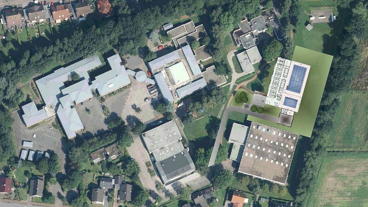 Hier könnte gebaut werden: Rechts ist oberhalb der Dreifachhalle das neue Hallenbad eingezeichnet. Kleinspielfeld und Soccerplatz müssten weichen. | © Constrata