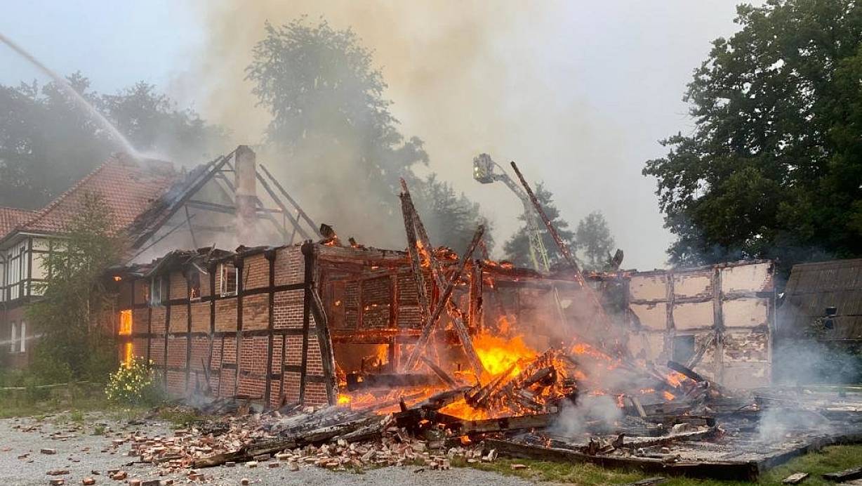 Die Scheune auf dem Hof Furlkröger steht in Flammen, der Dachstuhl und mehrere Wände sind bereits eingestürzt. | © Ralph Meyer